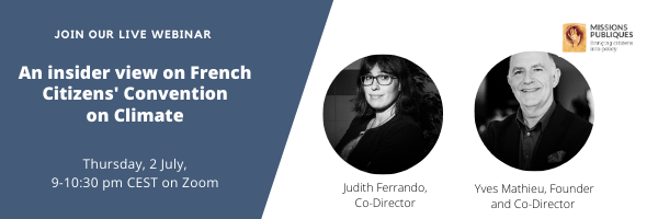 Yves Mathieu, and Judith Ferrando, as Co-Directors of Missions Publiques, both deeply involved in the Convention, will provide you with key learnings of the assembly from its launch in 2019 to their invitation to the Elysée Palace. They will describe, explain, and illustrate how this far-reaching process will change society in depth.